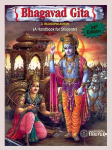 Bhavan’s Book University has published a wonderful handbook for students, written by Chakravarti Rajagopalachari who was popularly known as Rajaji or C.R., the author of numerous books. Rajaji’s Bhagwad Gita reveals the profound wisdom of Lord Krishna’s sermons. Through such a book, the reader is inspired to go into the meaning of deeper thought. Indeed, Gita is considered, universally a unique piece of many treasures... because it does not refer to one historical battle; it is much more than that... it is about the eternal connectivity between the soul and God.