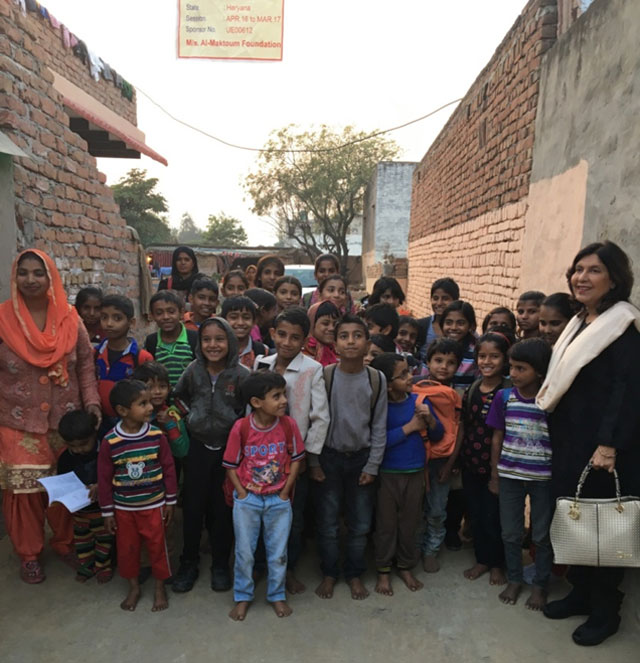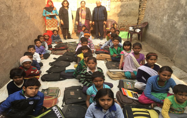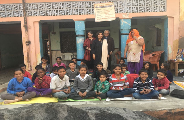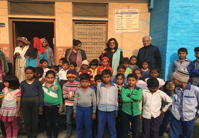 Geeta Chhabra (in black outfit) visits EKAL School on 23rd January 2017 in Atoha Village, Faridabad District, Haryana, India. The EKAL School is sponsored by the Al Maktoum Foundation-Dubai, UAE. Seen in the photo are also Sunila Bhatia and Vijay Sethi (EKAL volunteers) with the EKAL teacher in orange veil who is from the village, itself.