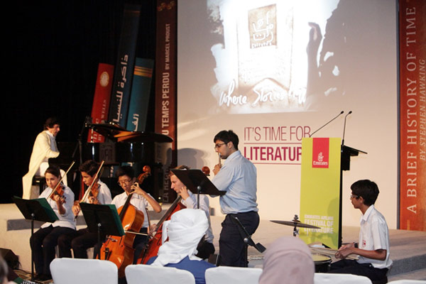 Jason Kouchak, concert pianist – on the piano with music students from Dubai College in the foreground performing the bespoke tune Sands of Time composed by Jason Kouchak, especially for the 2016 LitFest.