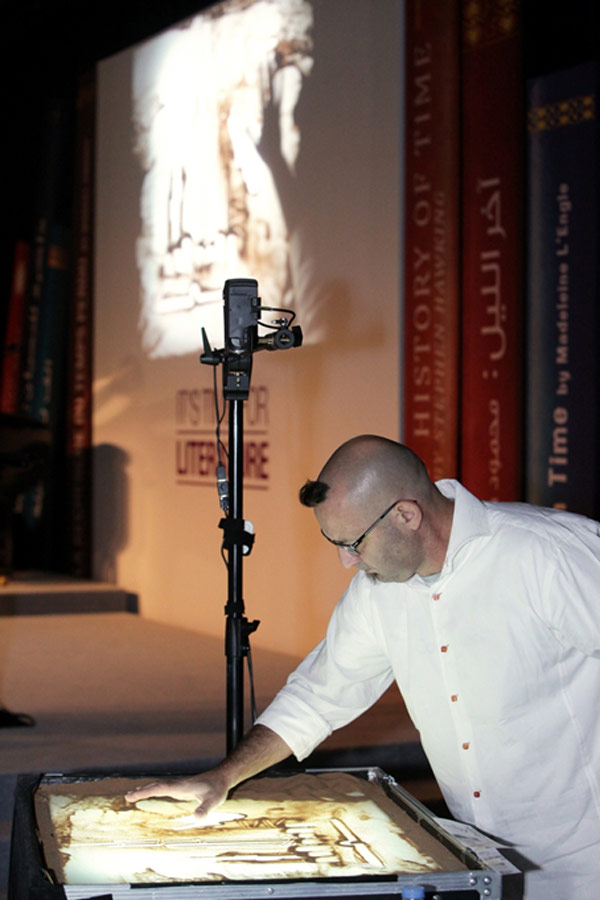 Luc Marin – Sand Artist sharing the full list of authors names in sand… during the launch event.