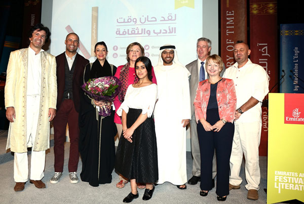 Front row – (Left to Right) – Asma Qais-Emcee, Yvette Judge-Assistant Director of the Emirates Airline Festival of Literature.