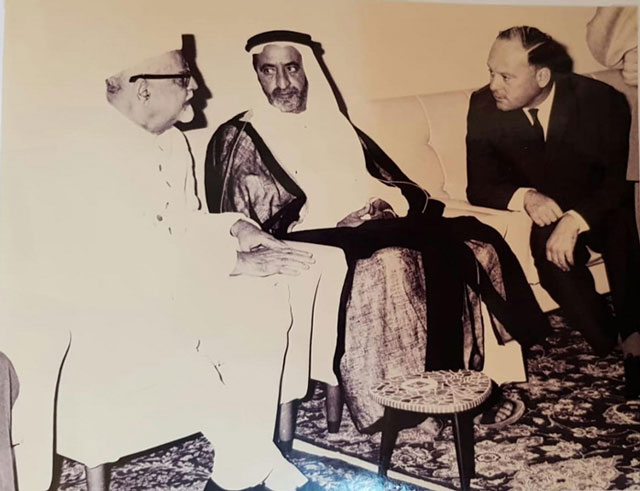 In the year of 1967 – H.H. Sheikh Rashid Bin Saeed Al Maktoum with Indian President, Dr. Zakir Hussain, who stopped in Dubai for a few hours, on his way back from Haj in Jeddah, to New Delhi.
