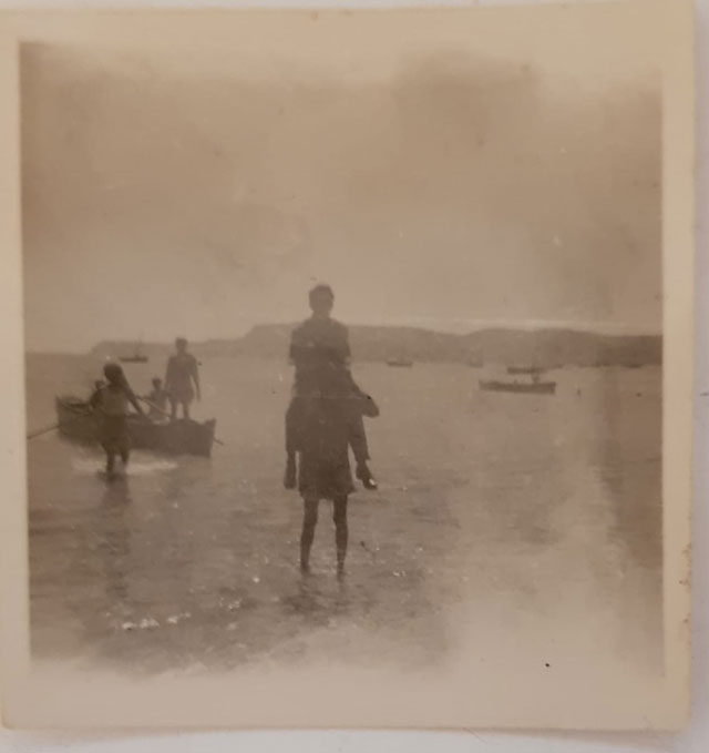 A coolie carrying Narain R. Sawlani on his shoulder and bringing him from mid-stream’s small boat to the shores of Gwadar. This picture was taken by one of his relatives, in March 1958, when he visited his father and maternal uncle at Gwadar.