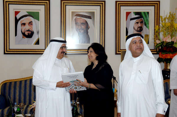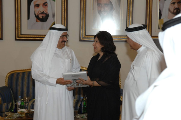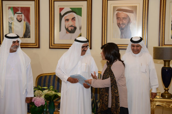 Geeta Chhabra presenting a scroll of her poem: An Ode to H.H. Sheikh Hamdan Bin Rashid Al Maktoum at Zabeel Palace on 11th March 2015.