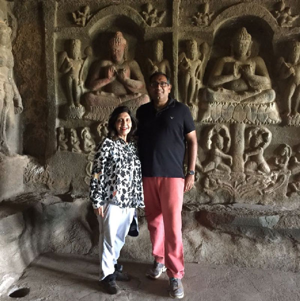 Geeta Chhabra and Viresh Chhabra in admiration of the rock carvings-Maharashtra.