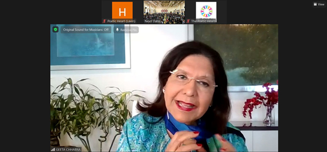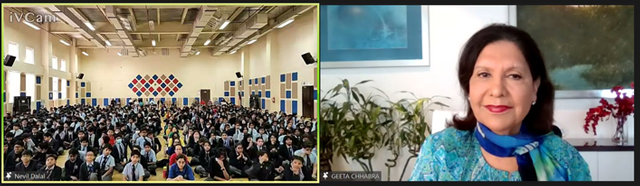 Geeta Chhabra sharing her poetic journey with the pupils and faculty members of Mayoor Private School over a zoom session.