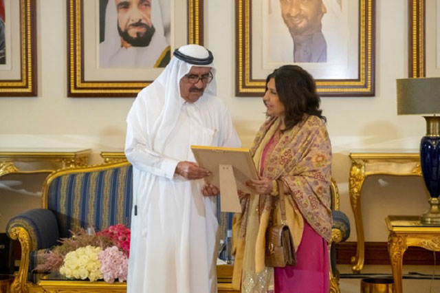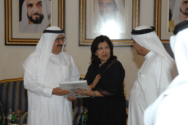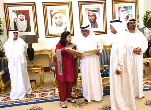 Geeta Chhabra presenting a scroll of her poem: An Ode to H.H. Sheikh Hamdan Bin Rashid Al Maktoum at Zabeel Palace on 11th March 2015.