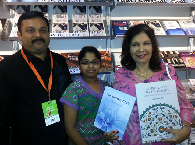 (From Left to Right) – Geeta Chhabra with Dr. Hassan Elmrani (Poet) and his daughter, Iitimad Elmrani – at the book launch of Dr. Hassan Elmrani’s Arabic book in prose. The title translates into the English language as – The Scarf of Scherazad – the launch was at the Sharjah International Book Fair.