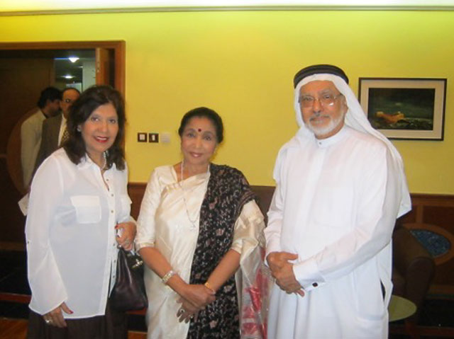 (From Left to Right) – Geeta Chhabra with the iconic singer, Asha Bhosle, from Mumbai and renowned poet, Dr. Shihab Ghanem of UAE at the MAI film screening held in Dubai on 22nd December 2013.