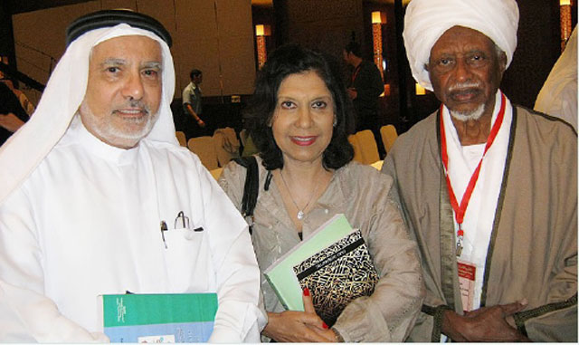 (From Left to Right) – Dr. Shihab Ghanem, Geeta Chhabra, Mr. Swar Al Dhahab – Ex-President of Sudan & presently Chairman of the Islamic Call Organization at the Abdul Aziz Saud Al-Babtain Foundation, Forum: “Poetry for Peaceful Co-existence” held at Festival City, Dubai, UAE from 17th October to 19th October 2011.
