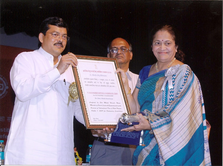 Dr. Sheilu Srinivasan receiving Vayoshreshtha Samman 2009 Award for Economic Leadership.