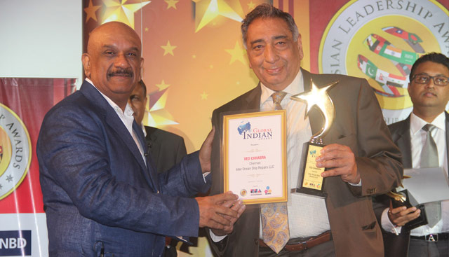 Dr. R.L.Bhatia – Founder, World CSR Day, presenting Ved Chhabra the Asian Leadership Award (Global Indian) at Taj Palace Hotel, Dubai-UAE on 24th September 2014.