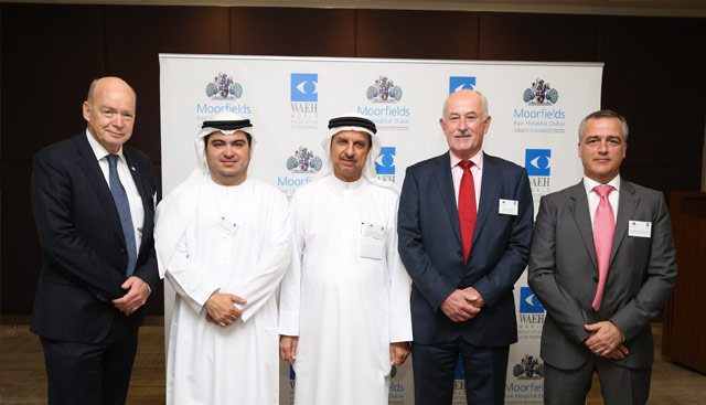 (From Left to Right) – Dr. Kees Sol-Chairman of the WAEH, Mr. Marwan Abedin-CEO of Dubai Healthcare City, Dr. Hussain Abdelrahman Al Rand-Assistant Undersecretary for Health Centers and Clinics, Ministry of Health, UAE, Mr. John Pelly-Chief Executive of Moorfields Eye Hospital London, and Mariano Gonzalez-Managing Director of Moorfields Eye Hospital Dubai.